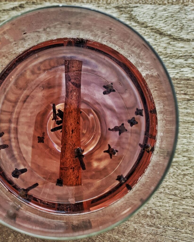 Doe de roséwijn in een pan op laag vuur. Voeg de kaneelstok, kruidnagel en frambozensiroop toe. Verwarm de glühwein langzaam zonder te koken. Laat het glühwein 10 minuten intrekken. Serveer de glühwein in een hittebestendig glas.