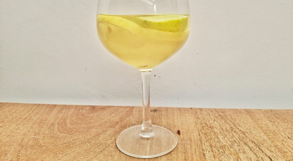 Mix alle ingrediënten in een glas met ijsblokjes in een wijnglas. Garneer met een limoenschijf of een schijfje peer.