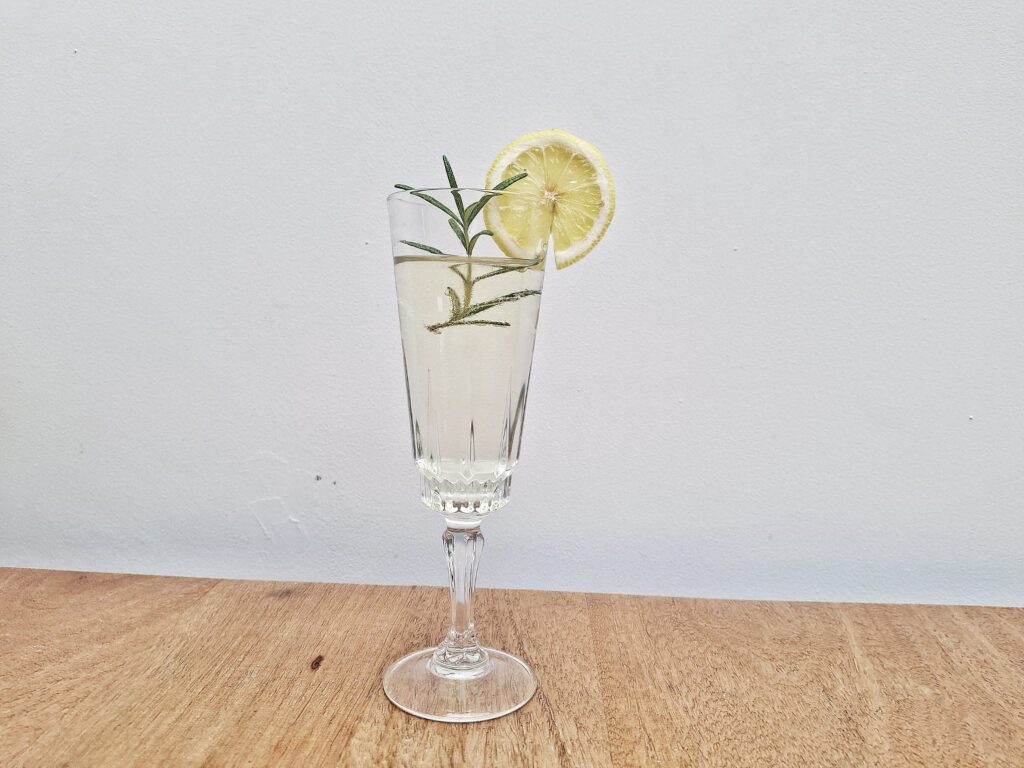 Giet het citroensap en siroop in een glas en top het af met mousserende wijn. Garneer met een citroenschil.